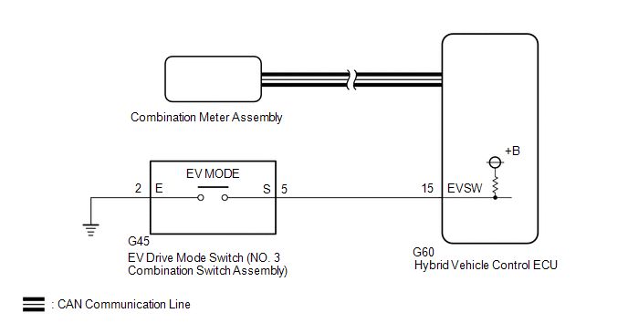The EV drive mode signal will be sent to the hybrid vehicle control ECU when the EV drive mode switch (NO. 3 combination switch assembly) is operated. If the specified conditions are met, the system enters EV drive mode and the vehicle will be driven using EV drive mode. This signal is then transmitted from the hybrid vehicle control ECU via CAN to the combination meter assembly to illuminate the EV drive mode indicator.