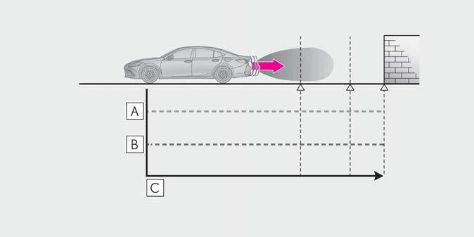 ■ Parking Support Brake function (static objects) Ultrasonic sensors are used to detect static objects, such as a wall, in the detection area when driving at a low speed or backing up.