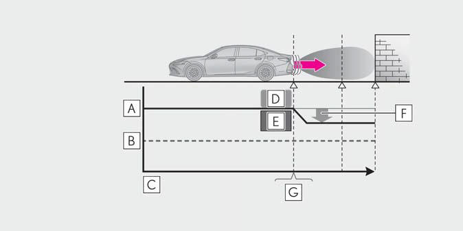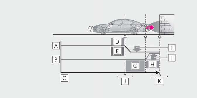 The Parking Support Brake system consists of the following functions that operate when driving at a low speed or backing up, such as when parking. When the system determines that the possibility of a collision with a detected object or pedestrian is high, a warning operates to urge the driver to take evasive action. If the system determines that the possibility of a collision with a detected object or pedestrian is extremely high, the brakes are automatically applied to help avoid the collision or help reduce the impact of the collision.