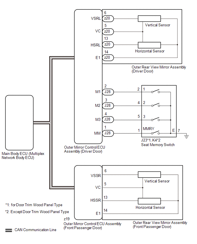 If any of the M1, M2 or M3 seat memory switch is pressed, the outer mirror control ECU assembly (driver door) detects the switch operation and sends the seat memory switch signal to the main body ECU (multiplex network body ECU) via CAN communication. On receiving the seat memory switch signal, the main body ECU (multiplex network body ECU) sends the memory request signal to each outer mirror control ECU assembly via CAN communication. When receiving this signal, each outer mirror control ECU assembly stores the mirror surface position based on information from the mirror position sensor, which is built into the outer rear view mirror assembly.
