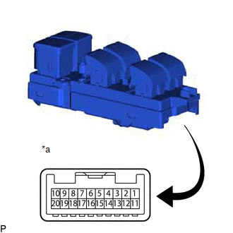 | (a) Check that the LEDs illuminate. (1) Apply auxiliary battery voltage to the multiplex network master switch assembly and check that the LEDs illuminate. OK: | Battery Connection | Specified Condition | | Auxiliary battery positive (+) → 3 Auxiliary battery negative (-) → 13 | LEDs illuminate | If the result is not as specified, replace the multiplex network master switch assembly. | | | *a | Component without harness connected (Multiplex Network Master Switch Assembly) | | |