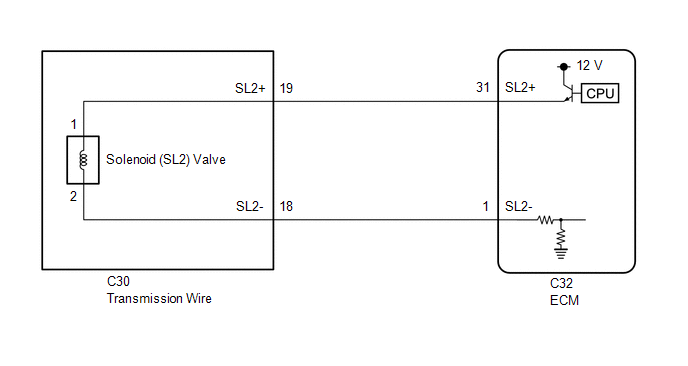 | 1. | CHECK HARNESS AND TRANSMISSION WIRE (TRANSMISSION WIRE (SOLENOID (SL2) VALVE) - ECM) |