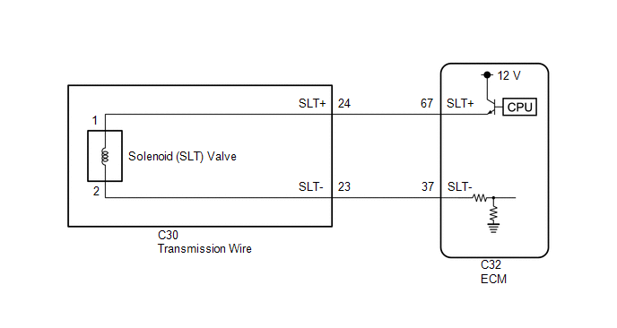 When a short to +B in the solenoid (SLT) valve circuit is detected, the ECM will determine that there is a malfunction, illuminate the MIL and store this DTC.