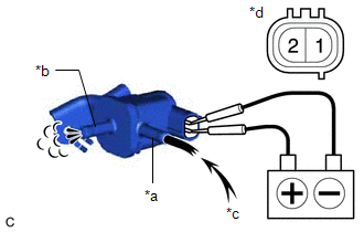 | (b) Apply battery voltage between the terminals of the purge valve (purge VSV) and check that the following occurs when blowing air into the port (E). OK: