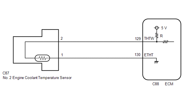 The No. 2 engine coolant temperature sensor is used to monitor the engine coolant temperature. The No. 2 engine coolant temperature sensor has a thermistor with a resistance that varies according to the temperature of the engine coolant. When the engine coolant temperature is low, the resistance in the thermistor increases. When the temperature is high, the resistance decreases. These variations in resistance are reflected in the output voltage from the sensor. The ECM monitors the sensor voltage and uses this value to calculate the engine coolant temperature. If the No. 2 engine coolant temperature sensor output voltage deviates from the normal operating range, the ECM interprets this as a malfunction of the No. 2 engine coolant temperature sensor circuit, illuminates the MIL and stores a DTC.