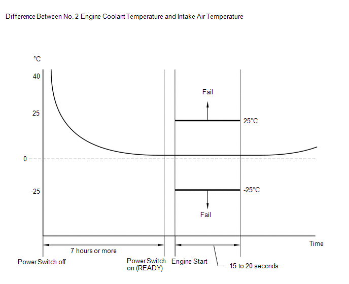 The ECM monitors the difference between the No. 2 engine coolant temperature and the intake air temperature when the engine is started cold to accurately detect the engine temperature conditions. The monitor runs when the engine is started after 7 hours or more have elapsed since the power switch was turned off in the previous trip. If the difference between the engine coolant temperature and the intake air temperature on a cold start exceeds 25°C (45°F), the ECM interprets this as a malfunction in the No. 2 engine coolant temperature sensor circuit or intake air temperature sensor circuit, illuminates the MIL and stores this DTC.