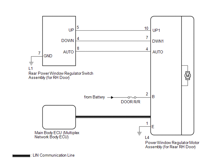 When the engine switch is on (IG), the power window regulator motor assembly (for rear RH door) is operated by the rear power window regulator switch assembly (for RH door). The power window regulator motor assembly (for rear RH door) has motor, regulator, and ECU functions.