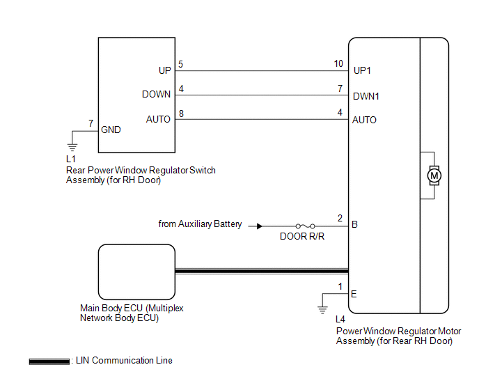 When the power switch is on (IG), the power window regulator motor assembly (for rear RH door) is operated by the rear power window regulator switch assembly (for RH door). The power window regulator motor assembly (for rear RH door) has motor, regulator, and ECU functions.