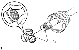 | (d) Align the matchmarks and place the beveled side of the tripod joint axial spline toward the rear drive outboard joint shaft assembly LH. NOTICE: Face the serrated side of the tripod joint outward and install it to the outboard joint end. |
