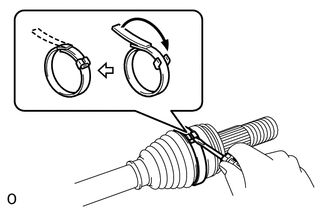 | (a) Using a screwdriver, install the rear No. 2 drive shaft outboard joint boot clamp LH as shown in the illustration. NOTICE: Be careful not to damage the outboard joint boot. |
