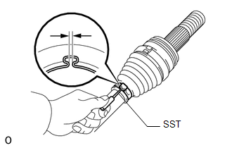 | (d) Using SST, measure the clearance of the rear drive shaft outboard joint boot clamp LH. SST: 09240-00021 Standard Clearance: 1.2 mm (0.0472 in.) or less NOTICE: If the measured value exceeds the specified value, retighten the rear drive shaft outboard joint boot clamp LH. |