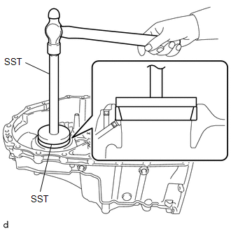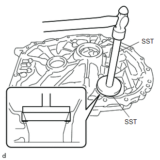 | (a) Using SST and a hammer, install a new front differential case rear tapered roller bearing (outer race) to the automatic transaxle case sub-assembly. SST: 09951-00850 SST: 09950-70010 09951-07200 NOTICE: Be sure to install the front differential case rear tapered roller bearing (outer race) so that there is no clearance between the front differential case rear tapered roller bearing (outer race) and the automatic transaxle case sub-assembly. If there is any clearance, the turning torque of the differential case assembly cannot be measured correctly. |
