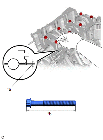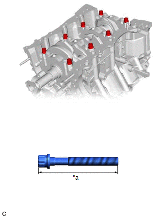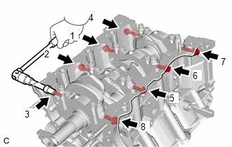 | (d) Temporarily install the 8 crankshaft bearing cap set bolts to the inside positions. Bolt Length: 100 to 102 mm (3.94 to 4.02 in.) |