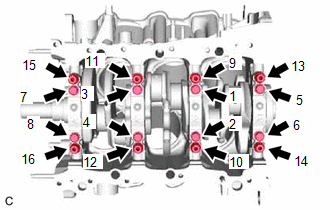 | (1) Uniformly tighten the 16 crankshaft bearing cap set bolts in several steps in the order shown in the illustration. Torque: 61 N·m {622 kgf·cm, 45 ft·lbf} HINT: If a crankshaft bearing cap bolt cannot be tightened to the specified torque, replace it. |