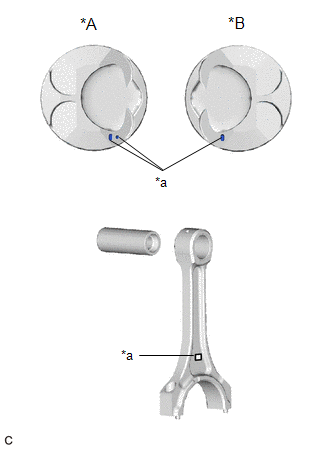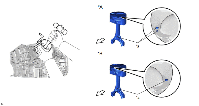 | (d) Align the front marks of the piston and connecting rod sub-assembly, and push in the piston pin with your thumb. HINT: The piston and piston pin are a matched set. |