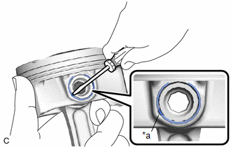 | (f) Check the fitting condition between the piston and piston pin. (1) Move the connecting rod back and forth on the piston pin. Check the fitting condition. HINT: If abnormal movement is felt, replace the piston and piston pin as a set. (2) Rotate the piston back and forth on the piston pin. Check the fitting condition. HINT: