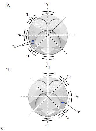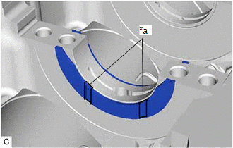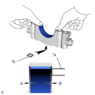| (c) Install the lower crankshaft bearings. (1) Install the lower crankshaft bearings to the crankshaft bearing caps. (2) Using a vernier caliper, measure the distance between the crankshaft bearing cap edge and lower crankshaft bearing edge. Difference Between (A) and (B): 0.7 mm (0.0276 in.) or less NOTICE:
