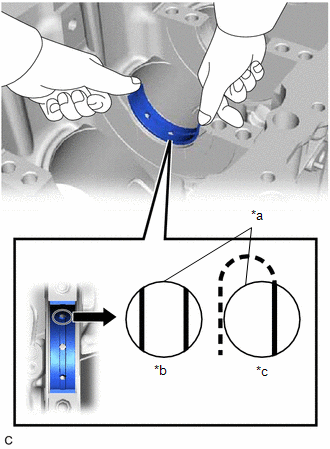 | (b) Install the upper crankshaft bearings. (1) Install the upper crankshaft bearings to the cylinder block sub-assembly as shown in the illustration. NOTICE: