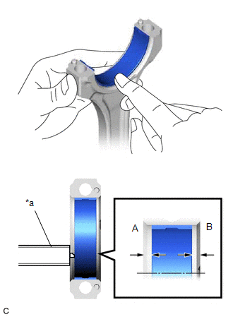 | (b) Using a vernier caliper, measure the distance between the connecting rod sub-assembly, connecting rod cap edges and the connecting rod bearing edge. Difference Between (A) and (B): 0.7 mm (0.0276 in.) or less NOTICE: Do not apply engine oil to the connecting rod bearings or the contact surfaces. |