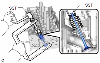 | (c) Using SST, compress each compression spring and install the 8 valve spring retainer locks. SST: 09202-70020 09202-01010 09202-01020 SST: 09202-00021 |