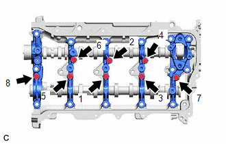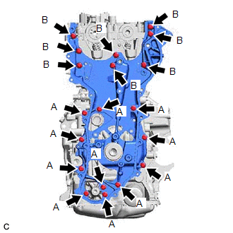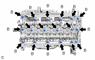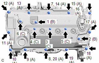 | (e) Using an 8 mm socket wrench, install the 2 camshaft position sensors (for Exhaust Side and for Intake Side) with 2 new bolts (B) and cylinder head cover sub-assembly with 4 new bolts (C) and 12 bolts (A) in the order shown in the illustration. Bolt Length: