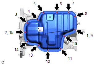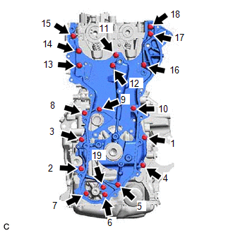 | (f) Tighten the 11 bolts in the order shown in the illustration to install the stiffening crankcase assembly. Torque: 43 N·m {438 kgf·cm, 32 ft·lbf} |