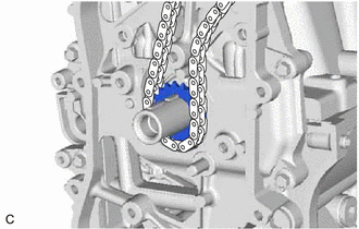 (d) With the oil pump drive chain sub-assembly placed around the oil pump drive sprocket and oil pump drive shaft sprocket, install the oil pump drive sprocket to the crankshaft and temporarily install the oil pump drive shaft sprocket to the oil pump drive shaft.
