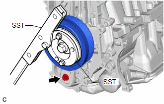 (b) Using SST, hold the crankshaft pulley assembly and install the crankshaft pulley bolt.