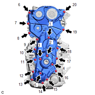 | (c) Temporarily install the No. 2 timing chain cover assembly to the timing chain cover assembly with the 20 bolts. NOTICE: Make sure there is no oil on the bolts. If oil is found on any bolt, clean it before installation. |