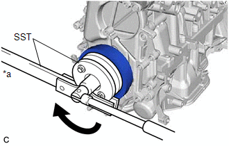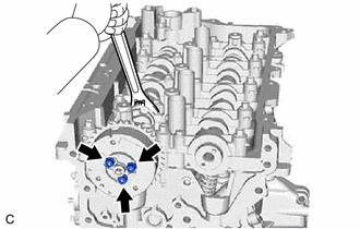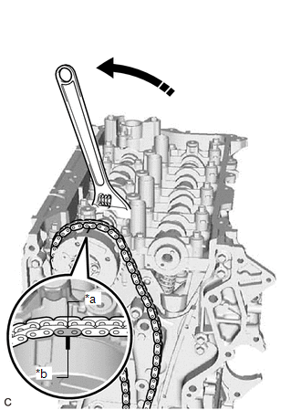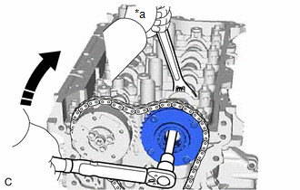 | (a) Hold the hexagonal portion of the No. 2 camshaft with a wrench and turn the camshaft timing exhaust gear assembly clockwise to loosen the chain sub-assembly between the camshaft timing exhaust gear assembly and crankshaft timing sprocket as shown in the illustration. |