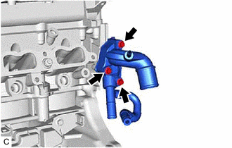 | (a) Using an 8 mm socket wrench, install the water by-pass outlet sub-assembly and a new outlet water pipe gasket to the cylinder head sub-assembly with the 3 bolts. Torque: 10 N·m {102 kgf·cm, 7 ft·lbf} |