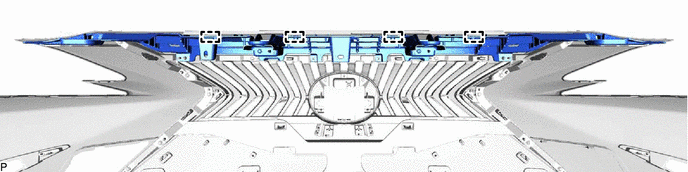 | (a) Engage the 6 guides and 2 claws to install the upper radiator grille moulding. |