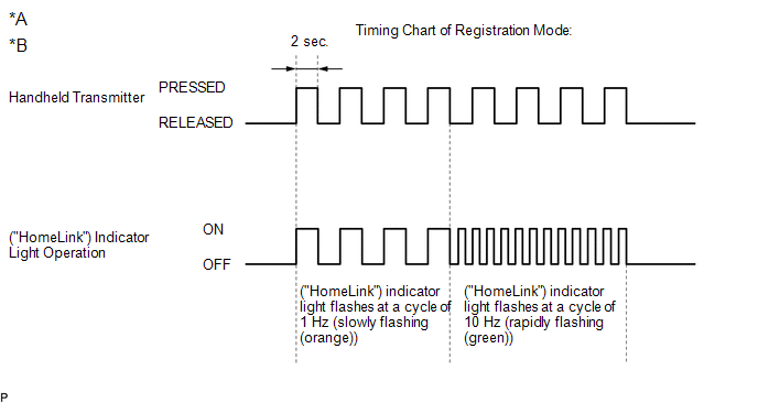(5) If the transmitter code registration was successful, the ("HomeLink") indicator light of the garage door opener flashes (green) at a cycle of 10 Hz (rapidly). If no malfunction occurs, release both the garage door opener ("HomeLink") switch and handheld transmitter button.