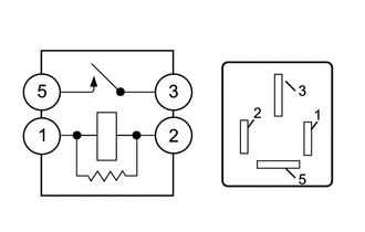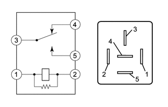 | (a) Measure the resistance according to the value(s) in the table below. Standard Resistance: | Tester Connection | Condition | Specified Condition | | 3 - 4 | Auxiliary battery voltage applied between terminals 1 and 2 | 10 kΩ or higher | | 3 - 4 | Auxiliary battery voltage not applied between terminals | Below 1 Ω | | 3 - 5 | Auxiliary battery voltage applied between terminals 1 and 2 | Below 1 Ω | | 3 - 5 | Auxiliary battery voltage not applied between terminals | 10 kΩ or higher | | 4 - 5 | Always | 10 kΩ or higher | If the result is not as specified, replace the DEF relay. | |