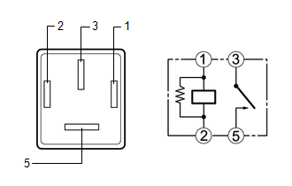 | (a) Measure the resistance according to the value(s) in the table below. Standard Resistance: | Tester Connection | Condition | Specified Condition | | 3 - 5 | Auxiliary battery voltage not applied between terminals 1 and 2 | 10 kΩ or higher | | Auxiliary battery voltage applied between terminals 1 and 2 | Below 1 Ω | If the result is not as specified, replace the WIPER relay. | |