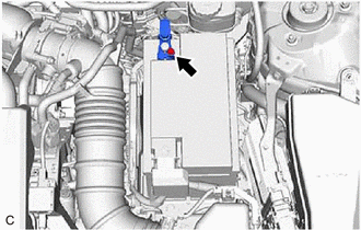 (a) Loosen the nut, and disconnect the cable from the negative (-) battery terminal. NOTICE: When disconnecting the cable, some systems need to be initialized after the cable is reconnected. Click here |