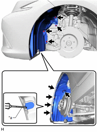 (b) Using a screwdriver with its tip wrapped with protective tape, disengage the 3 claws to separate the front fender liner.
