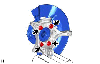 (b) Remove the 4 bolts, front axle hub sub-assembly and front disc brake dust cover from the steering knuckle.