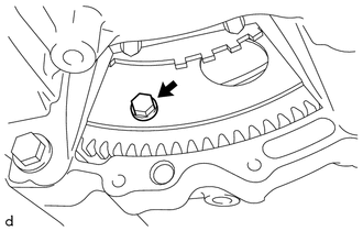 | (a) Turn the crankshaft to gain access to the 6 drive plate and torque converter assembly setting bolts and remove each drive plate and torque converter assembly setting bolt while holding the crankshaft pulley bolt with a wrench. HINT: There will be one black colored drive plate and torque converter assembly setting bolt. |