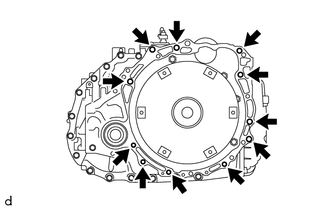 | (b) Remove the 11 bolts and automatic transaxle assembly. NOTICE: To prevent damage to the knock pins, do not pry between the automatic transaxle assembly and engine assembly. |