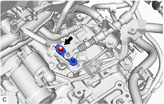 | (a) While disengaging the clip as shown in the illustration, disconnect the transmission control cable assembly from the transmission control shaft lever together with the clip. |