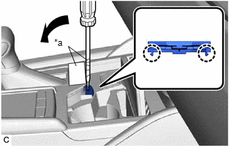 (b) Using a screwdriver with its tip wrapped with protective tape, disengage the 2 claws to remove the shift lock release button cover from the upper console panel sub-assembly.