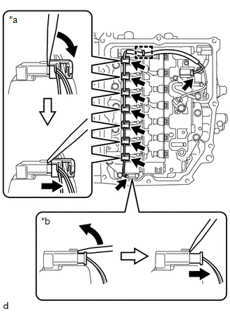 | (d) Remove the bolt and temperature sensor clamp and disconnect the temperature sensor from the transmission valve body assembly. |
