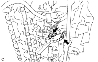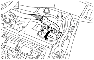 | (b) Disengage the clamp to disconnect the transmission wire from the solenoid lock plate. |
