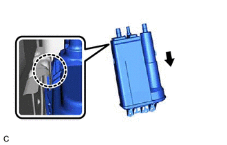 | (f) Disengage the claw and remove the canister (charcoal canister assembly) from vehicle body as shown in the illustration. |