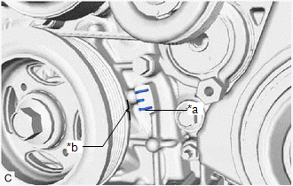 | (a) Turn the crankshaft pulley clockwise until its timing mark (cutout) is aligned with the timing mark on the timing chain cover assembly as shown in the illustration. |