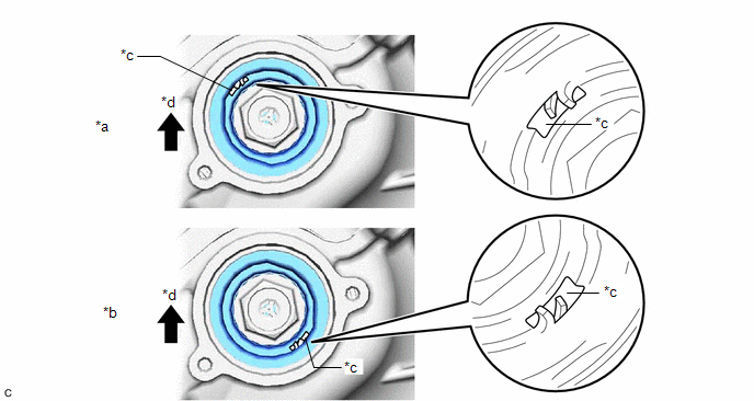 If the cutout of the camshaft timing gear assembly is not at the top, turn the crankshaft 360° clockwise and align the timing mark (cutout) of the crankshaft pulley with the timing mark on the timing chain cover assembly again.