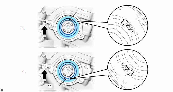 If the cutout of the camshaft timing gear assembly is not at the top, turn the crankshaft 360° clockwise and align the timing mark (cutout) of the crankshaft pulley with the timing mark on the timing chain cover assembly again.