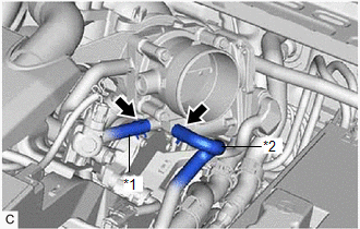| (a) Slide the 2 clips and disconnect the No. 2 water by-pass hose and No. 3 water by-pass hose from the throttle body with motor assembly. |