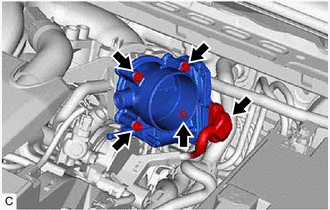 (c) Remove the 4 bolts and throttle body with motor assembly from the intake air surge tank assembly.